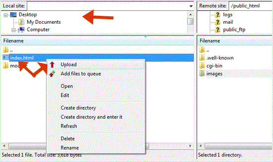 4. Under Local Site in FileZilla, open the directory where your website files are located. Right-click on your index file and choose Upload.